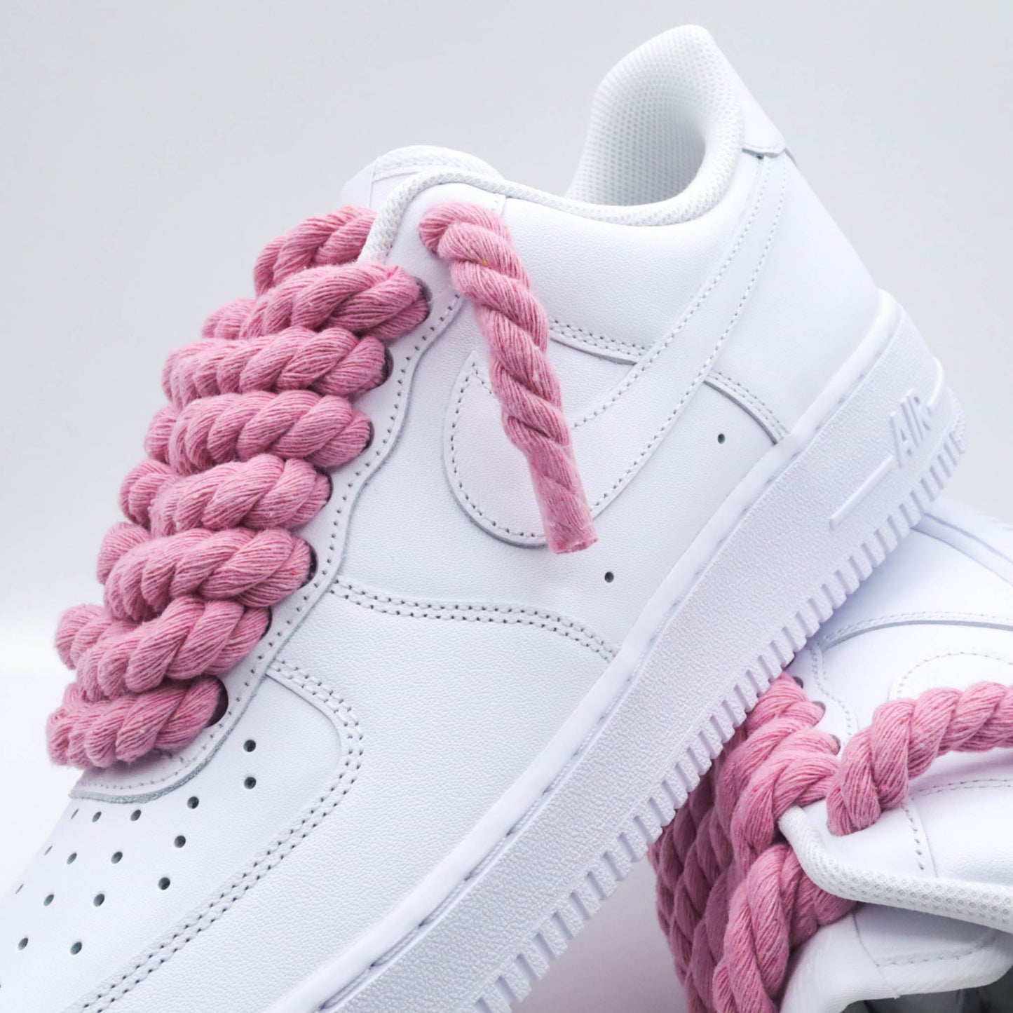 Sneakers Nike Air Force 1 Custom Rope Laces avec gros lacets en corde rose pastel.